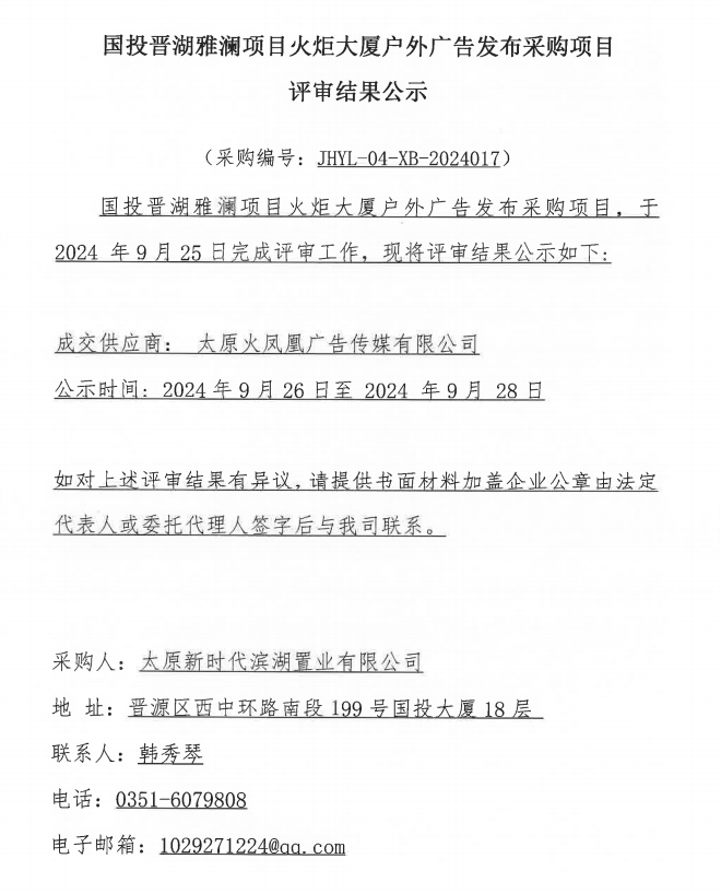 國投晉湖雅瀾項目火炬大廈戶外廣告發(fā)布采購項目評審結(jié)果公示