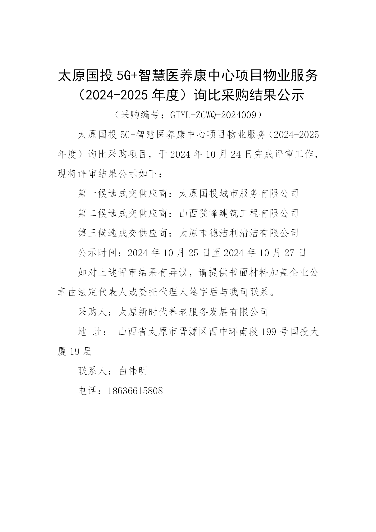 太原國(guó)投5G+智慧醫(yī)養(yǎng)康中心項(xiàng)目物業(yè)服務(wù)(2024-2025年度)詢比采購(gòu)結(jié)果公示