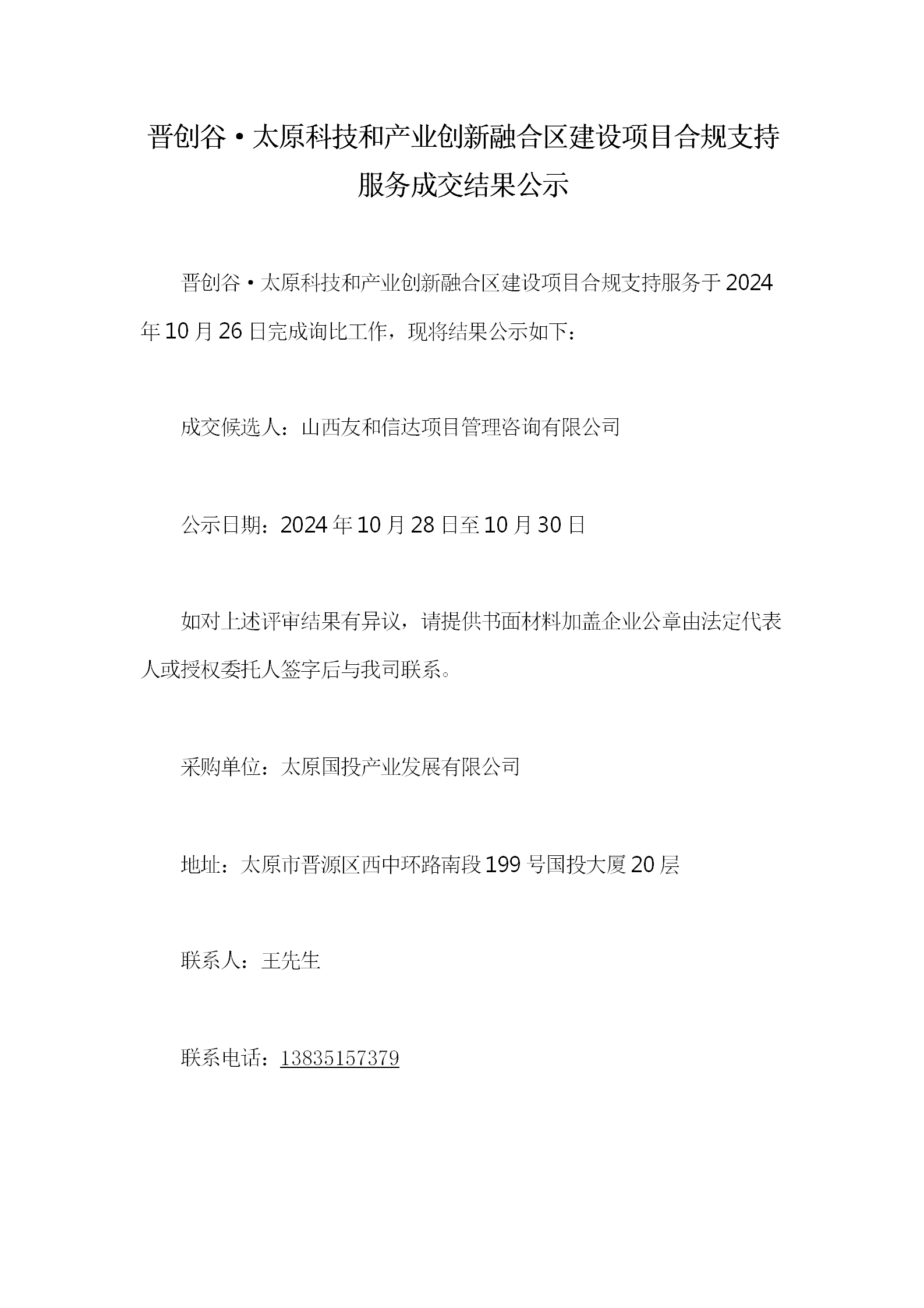 晉創(chuàng)谷·太原科技和產(chǎn)業(yè)創(chuàng)新融合區(qū)建設(shè)項目合規(guī)支持服務(wù)詢比采購結(jié)果公示