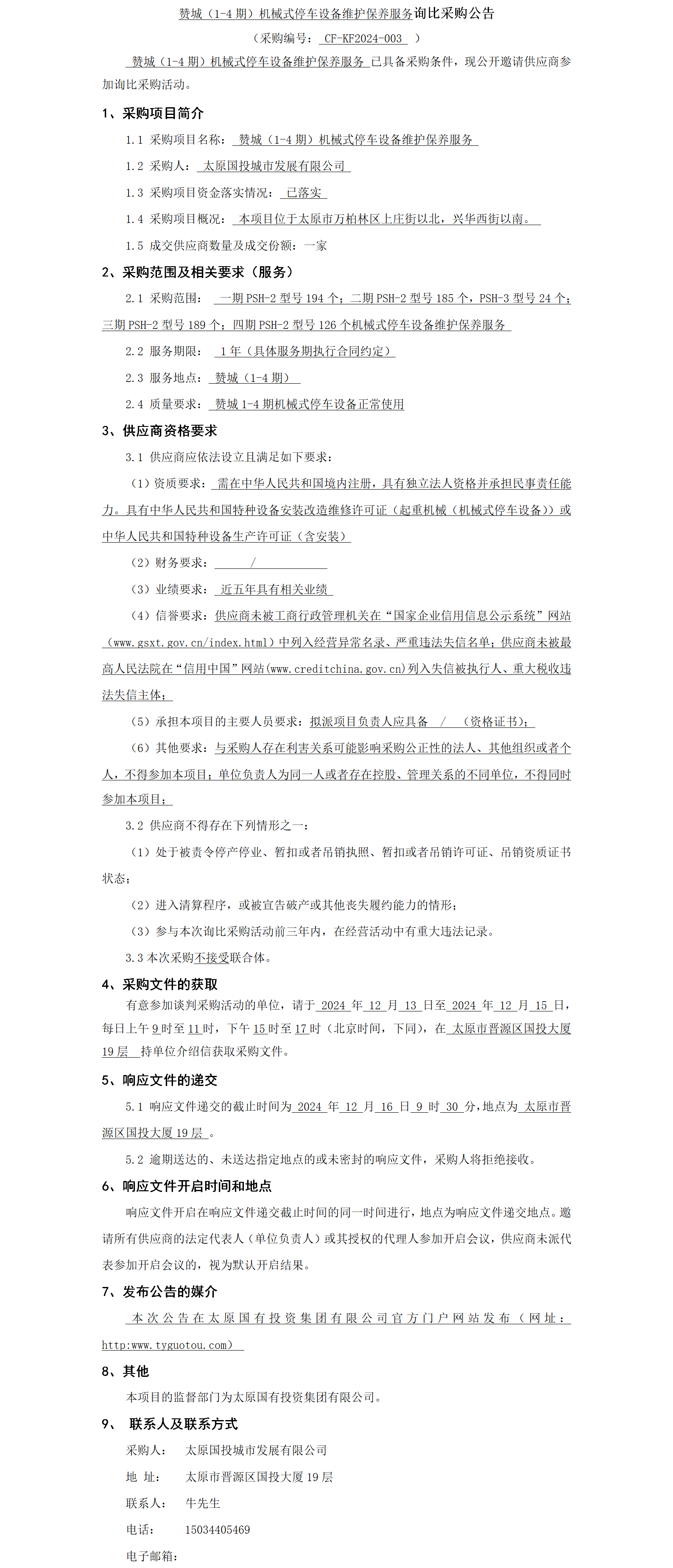 贊城(1-4期)機(jī)械式停車設(shè)備維護(hù)保養(yǎng)服務(wù)詢比采購(gòu)公告