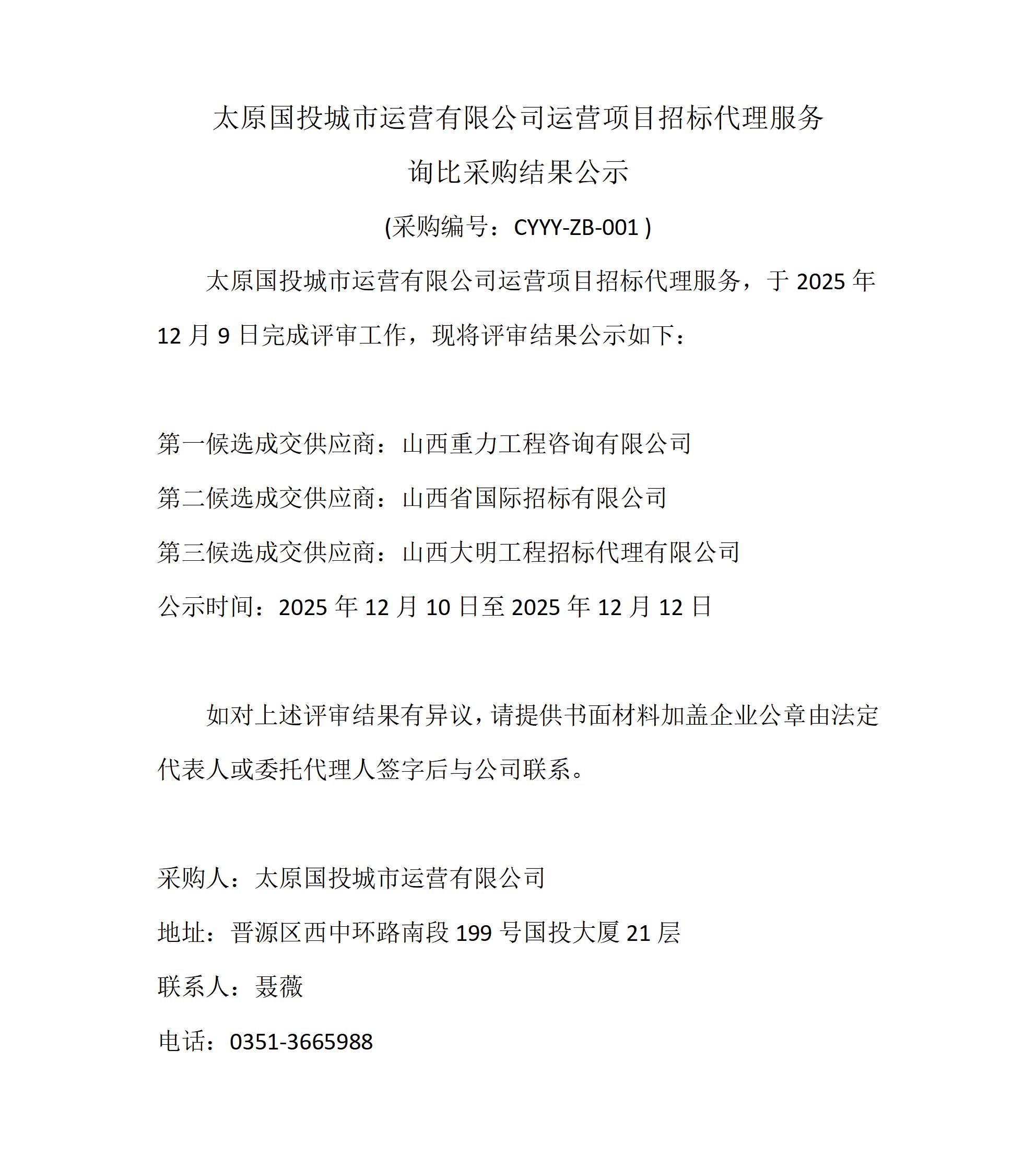 太原國投城市運營有限公司運營項目招標代理服務采購項目詢比采購結果公示