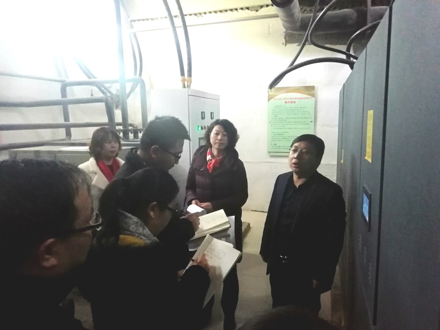 隨后,調(diào)研組參觀了能源站設(shè)備間、一號(hào)井井室及三號(hào)井井場(chǎng),詳細(xì)詢問(wèn)了供熱運(yùn)營(yíng)、地?zé)峋┕で闆r,并與我公司人員充分交流和討論了中深層無(wú)干擾地?zé)岬氖┕すに?、工程難度及項(xiàng)目進(jìn)行中存在的問(wèn)題等。